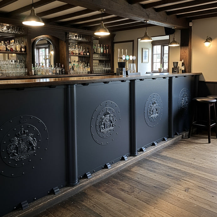 Our current bar front collection includes both decorative industrial bar front panels featuring intricate cast-style emblems and riveted detailing for a bold, vintage-inspired finish and sleek industrial metal bar fronts with clean, riveted panels offering a raw, workshop-inspired look that enhances both modern and rustic spaces.