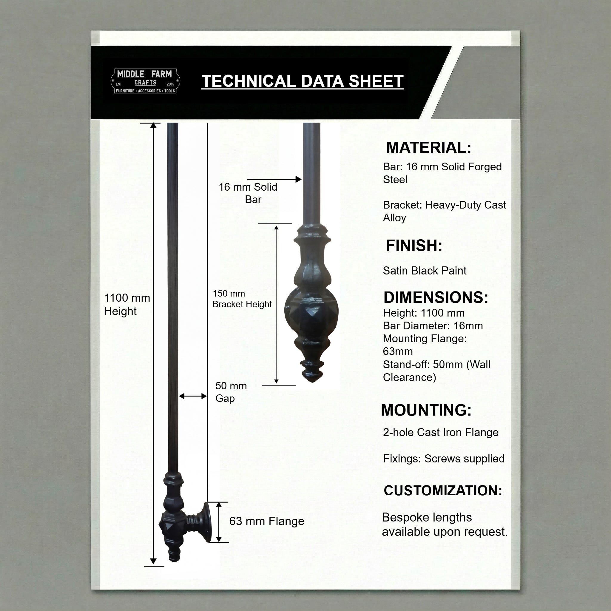 The focal point is the Heavy-Duty Cast Alloy Bracket (150mm tall), which features a decorative "bulb" or "finial" shape. This anchors a solid 16mm Steel Bar. The result is a staircase feature that feels architectural and stately.