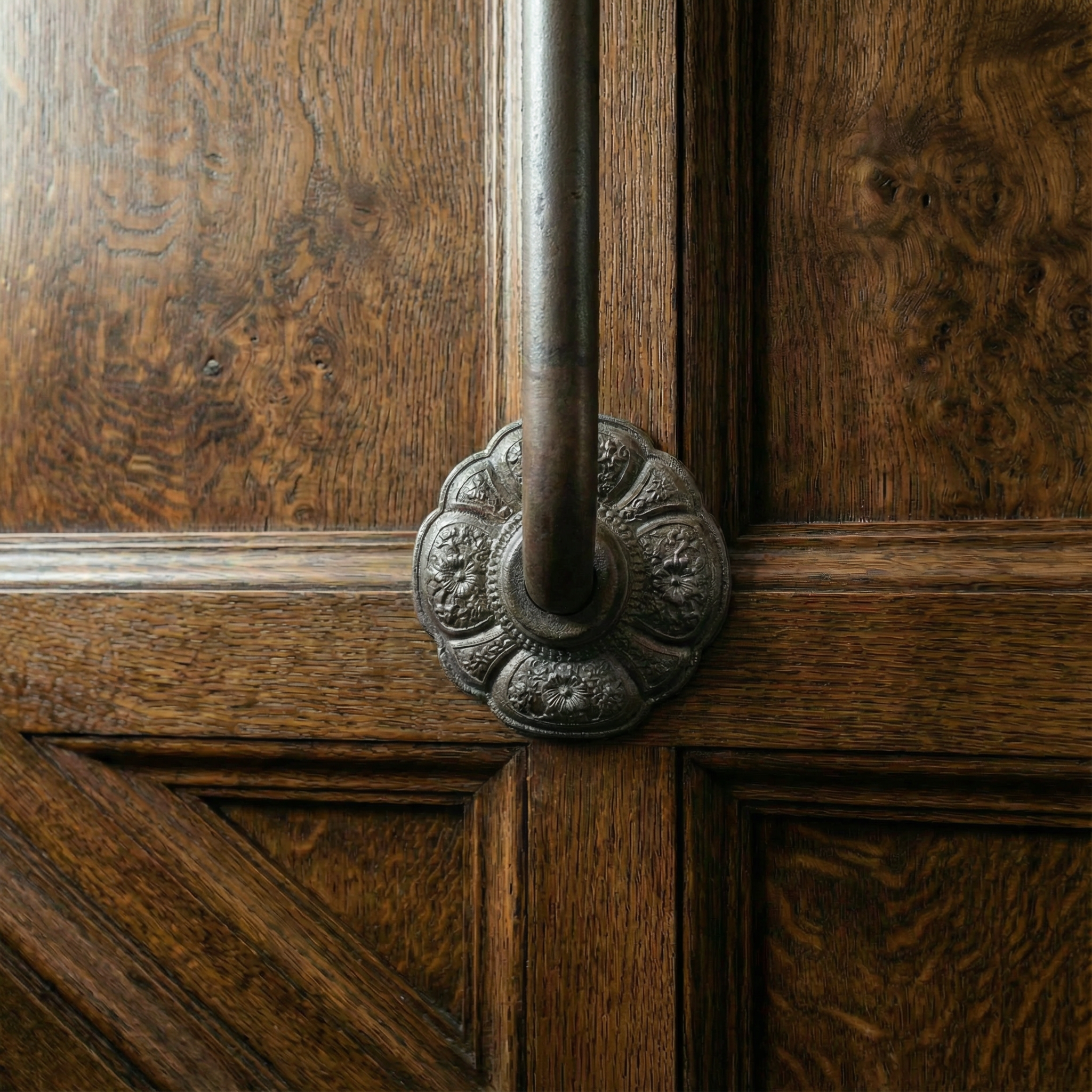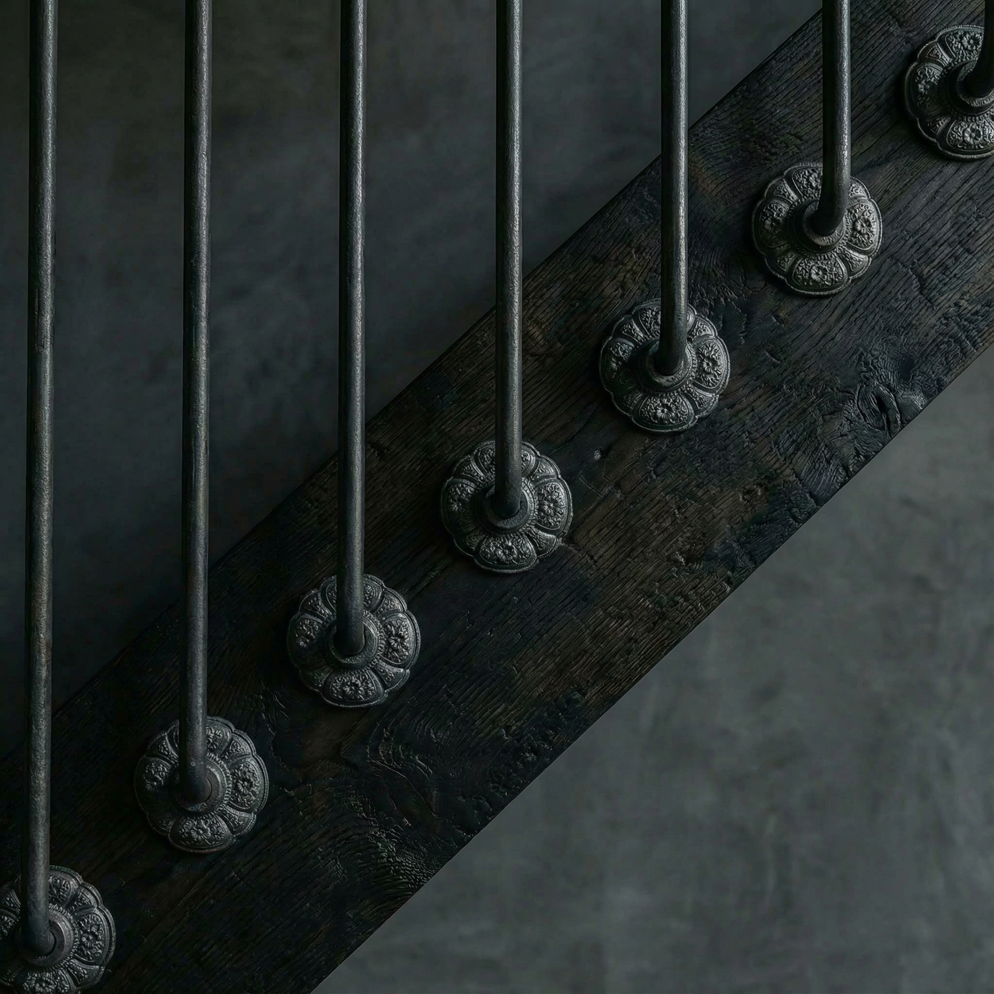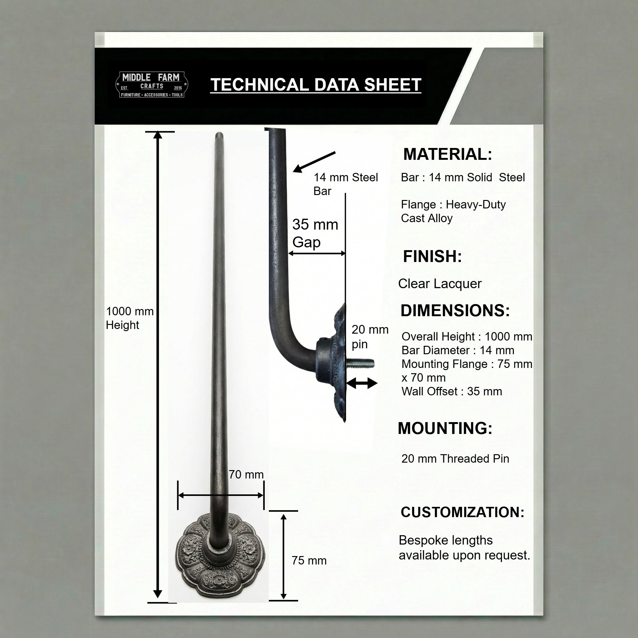 The centerpiece is the 75mm x 70mm Scalloped Flange. Its organic, slightly oval shape features deep-relief petal details. It holds a solid 14mm Steel Bar, finished in clear lacquer to reveal the "gunmetal grey" tones of the forged steel. This raw finish pairs exceptionally well with charred timber (Shou Sugi Ban), walnut, or light oak.
