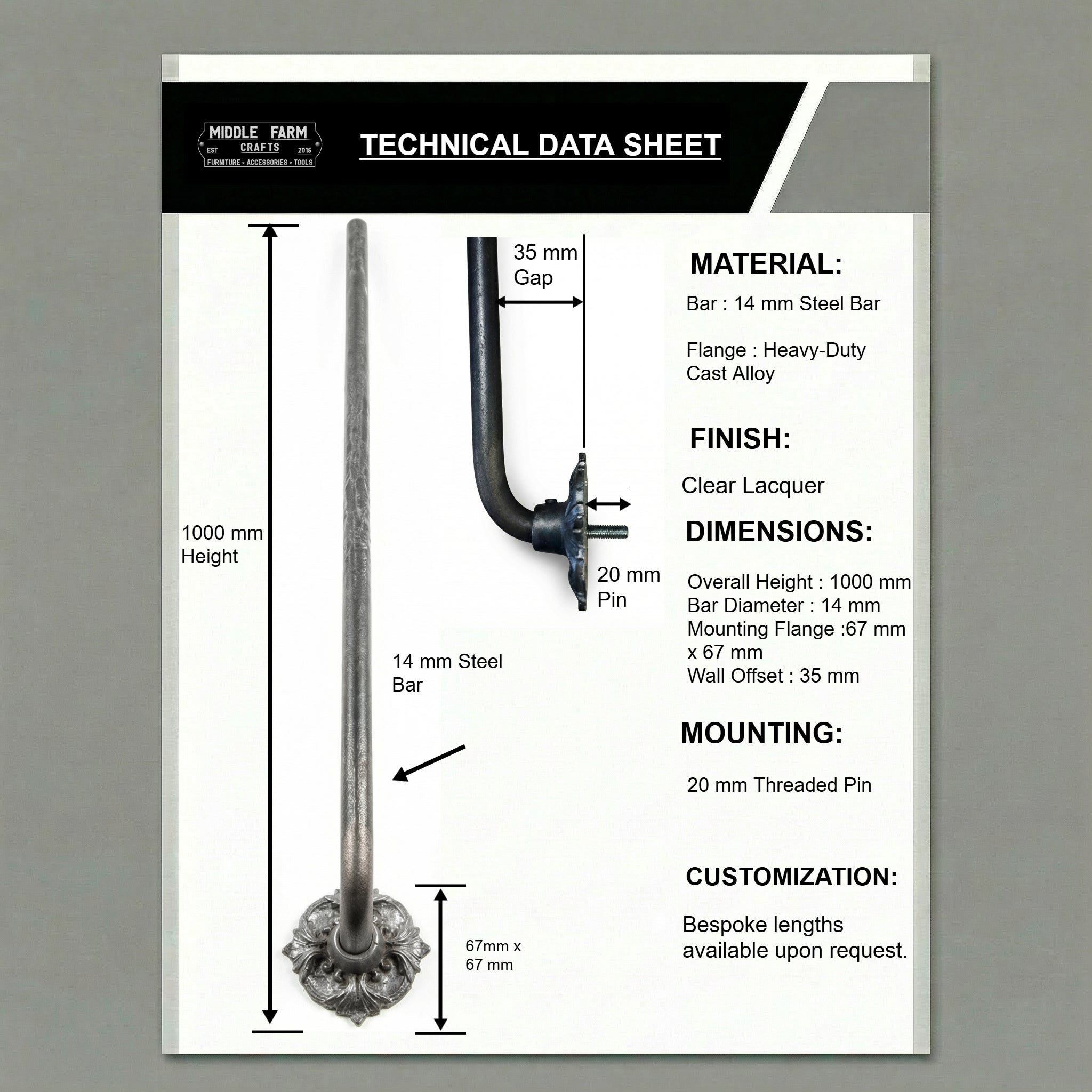 The mounting plate is a 67mm Cast Alloy Rosette with a scalloped, flower-like perimeter. It holds a solid 14mm Steel Bar, finished in clear lacquer to reveal the natural character of the forged metal. This style is heavily influenced by French Baroque and Art Nouveau ironwork, perfect for adding a touch of romance to your home.