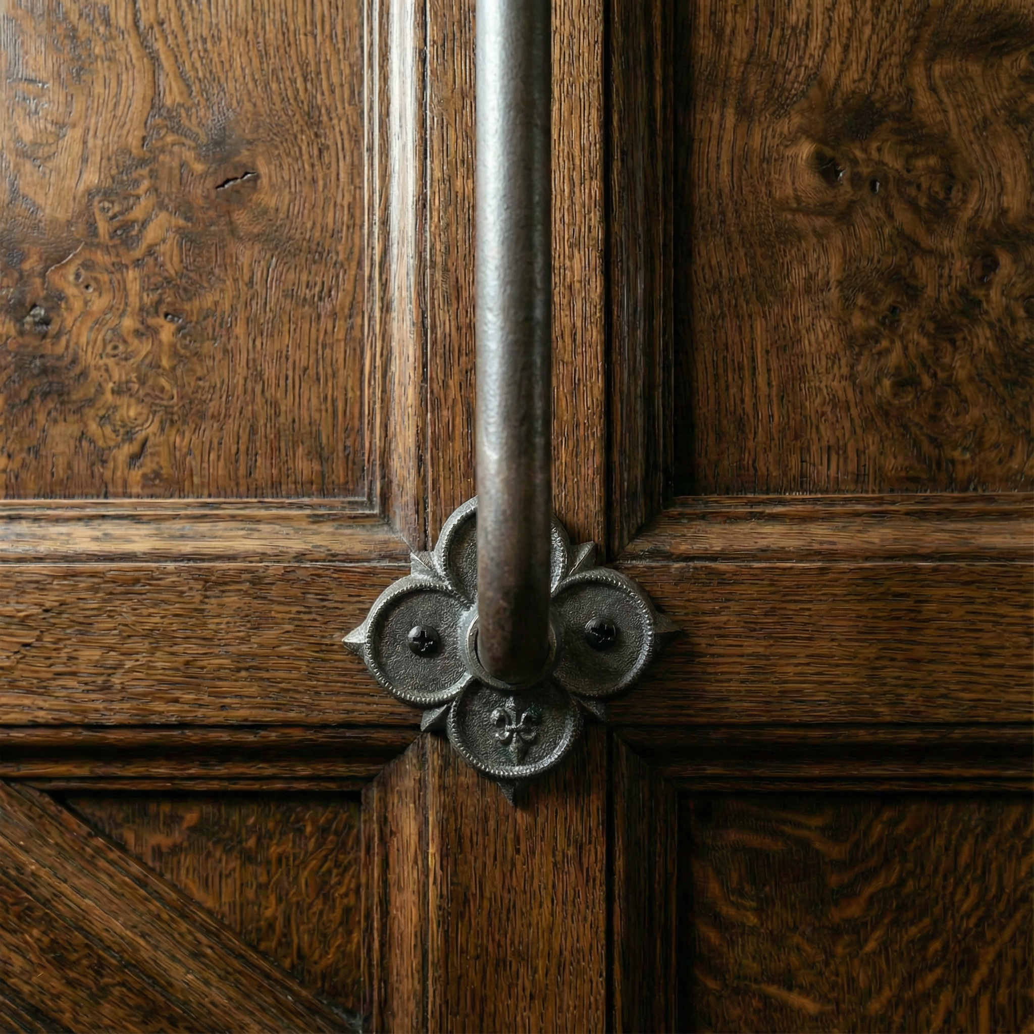 Each spindle features a heavy 14mm solid steel bar, anchored by Cast Iron backplates featuring the classic Fleur-de-lis motif. The texture is hand-finished to provide an authentic, aged iron look that contrasts beautifully against both natural oak and painted wood.