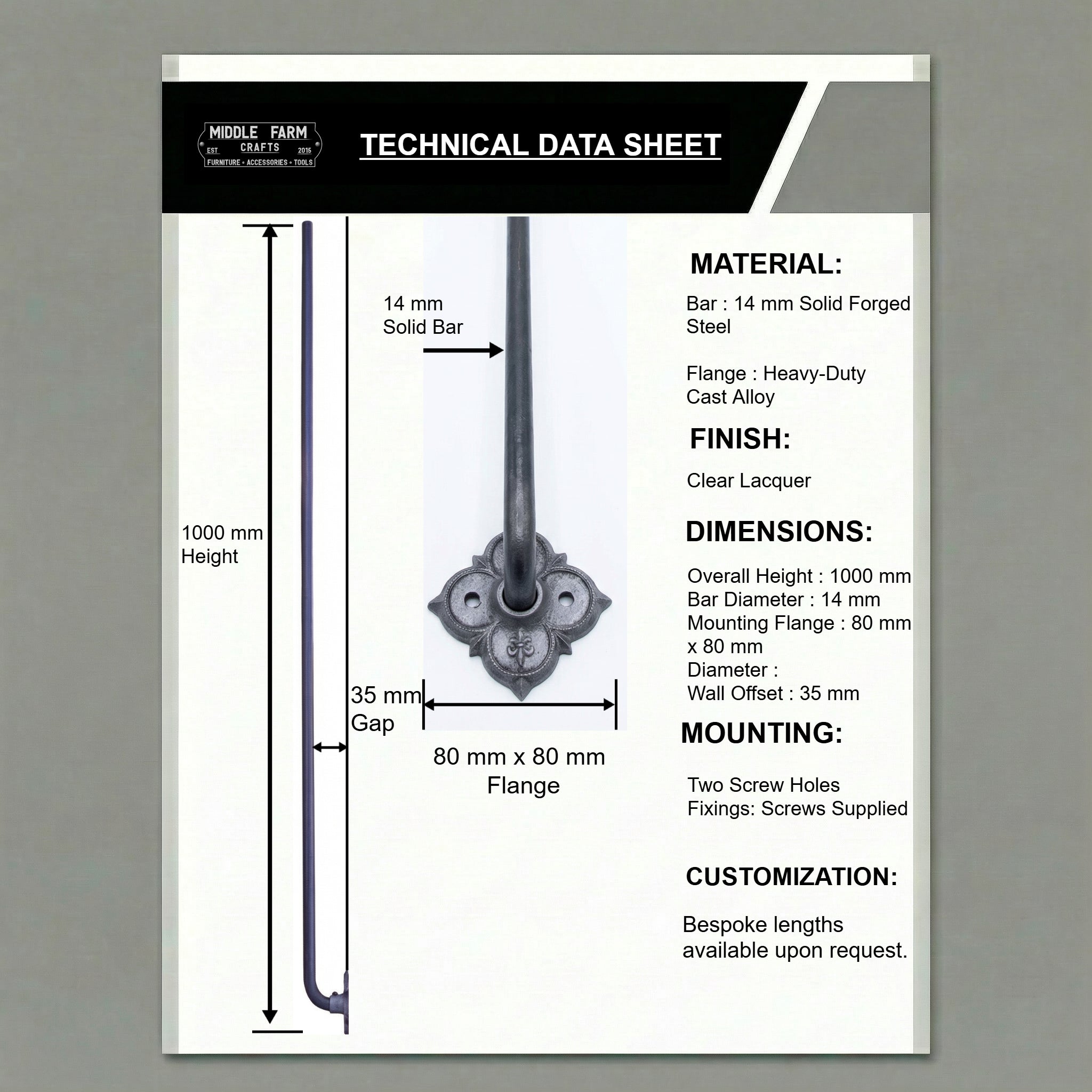 Material: 14mm Solid Steel Round Bar (Rail) with Cast alloy Floral Escutcheons (Plates).