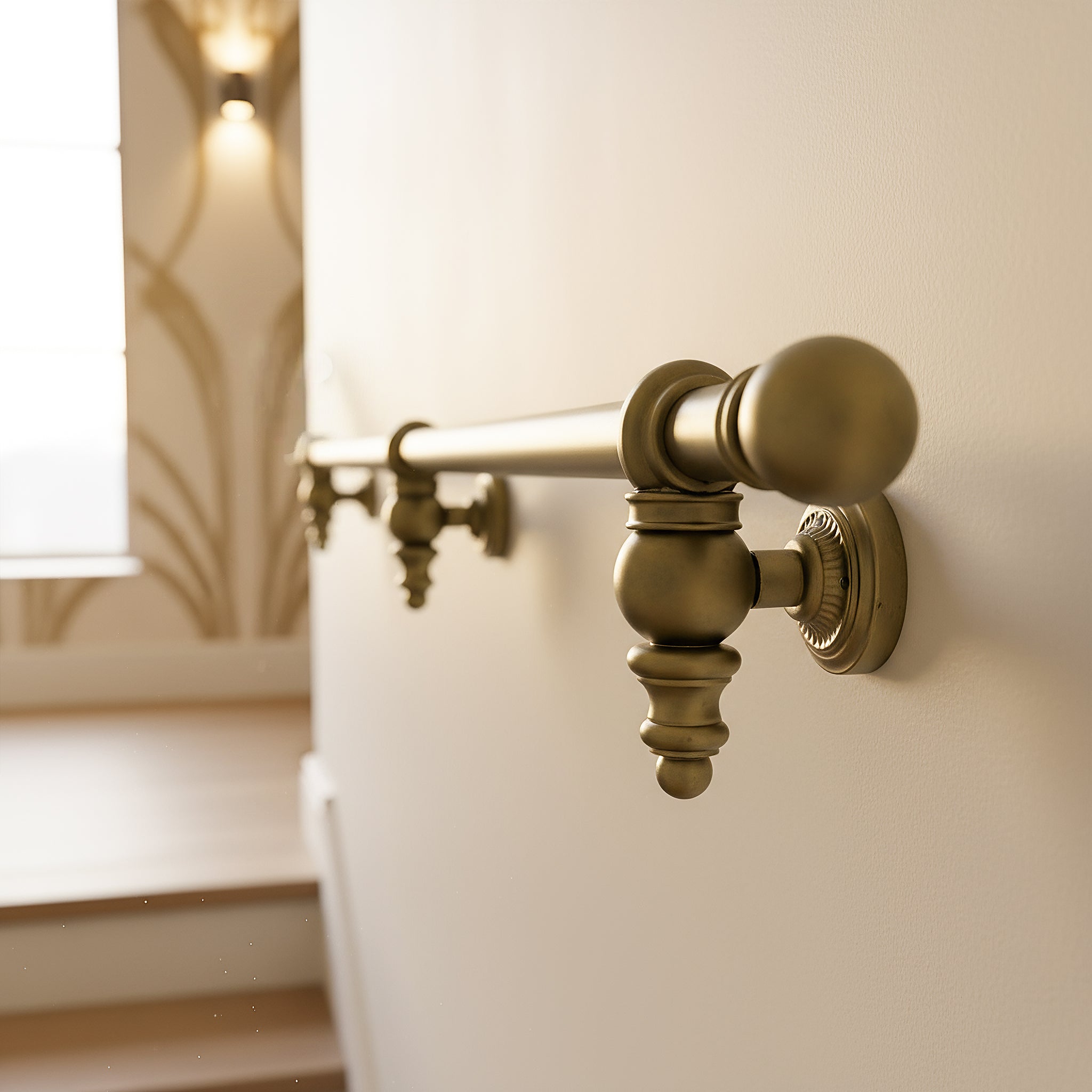✅ Sleek steel rail with bold ornate ball end caps and industrial wall mountings
